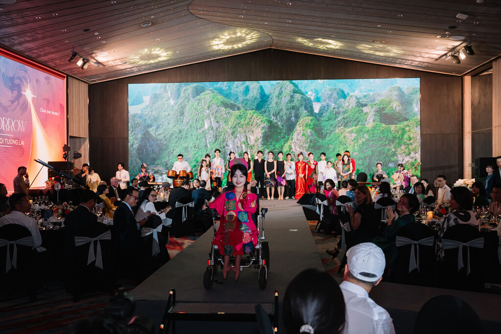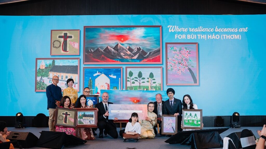 | La soirée est marquée par la présence de Bùi Thi Hao (Thom), jeune artiste peignant avec la bouche et déjà récompensée en 2025, symbole de résilience et de passion. |