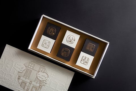 La boîte de gâteaux de lune de l’hôtel Lotte Hanoi illustre une cours de récréation lors de la nuit de la pleine lune. En plus des garnitures traditionnelles telles que les graines de lotus au longane séché, l'hôtel présente cette année trois nouvelles saveurs : melon, abricot et canneberge. Le coût d’une boîte de quatre gâteaux est de 750.000 dôngs (TVA incluse).