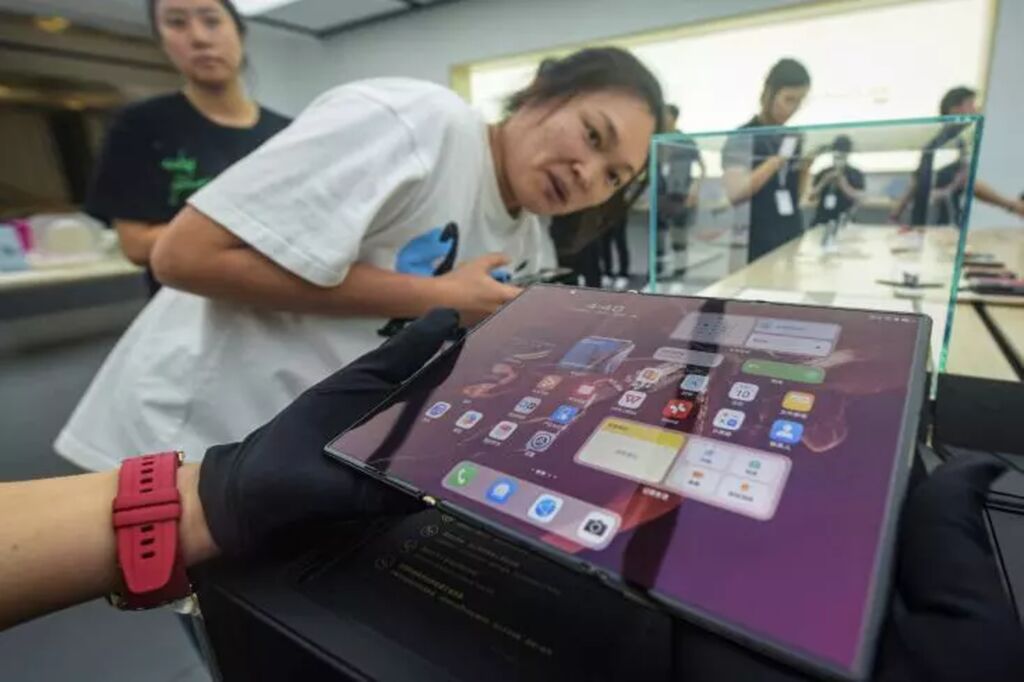 | Le nouveau téléphone pliable à trois volets du géant chinois de la technologie Huawei, le Huawei Mate XT, est présenté lors de son jour de lancement dans un magasin Huawei à Hangzhou, dans la province du Zhejiang, dans l'est de la Chine, le 10 septembre. |