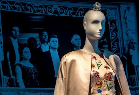 | Une robe créée par Hubert de Givenchy et portée par Jacqueline Kennedy lors d'une visite officielle en France en 1961 exposée à Calais, dans le Nord de la France, le 15 juin. |
