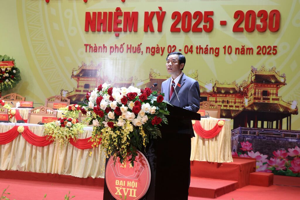 | Nguyên Van Phuong, secrétaire du 17e Comité du Parti de la ville de Huê pour le mandat 2025-2030, prononce un discours de clôture du XVIIe Congrès du Parti de la ville de Huê. |