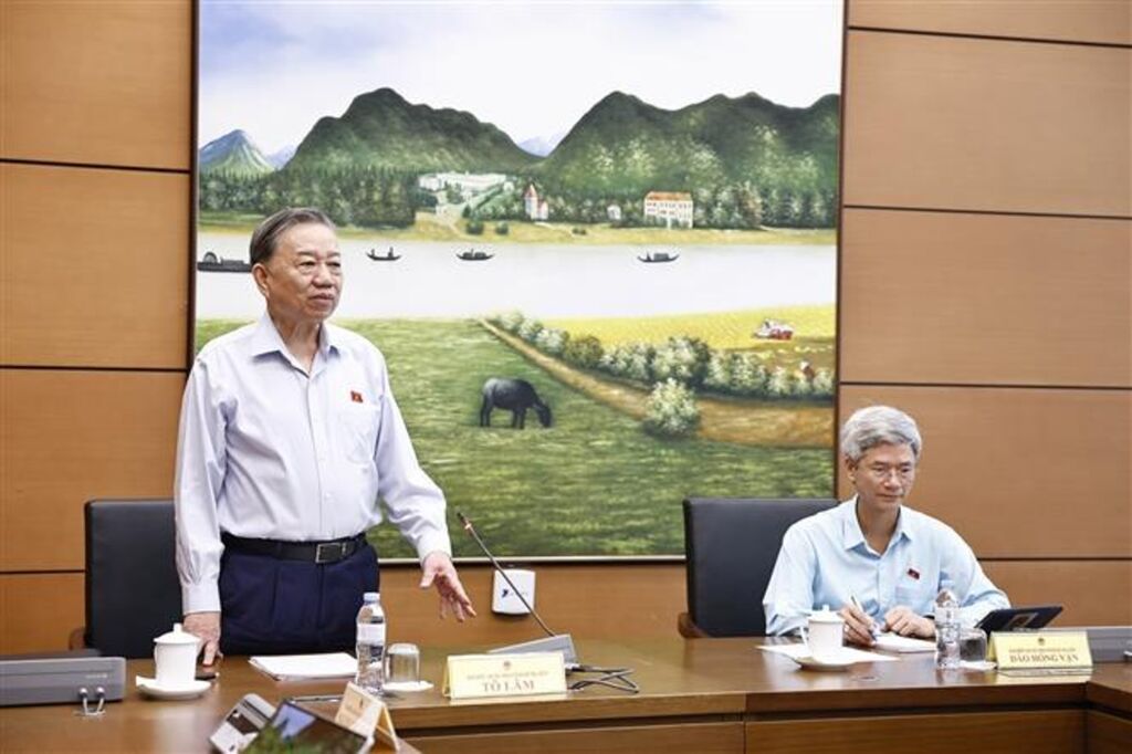 | Le secrétaire général du Parti, Tô Lâm (gauche), lors du débat en groupe dans le cadre de la 8e session de l’Assemblée nationale de la XVe législature. |
