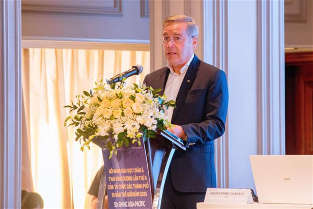 | Mikhael De Thyse, secrétaire général de l’Organisation des villes du patrimoine mondial, prend la parole lors de la conférence, le 15 octobre à Huê (Centre). |
