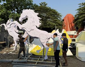 En selle pour la chevauchée des mascottes dans la rue florale Nguyên Huê