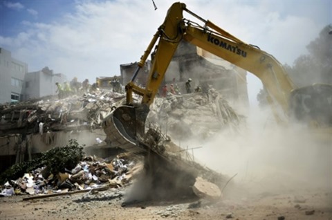 | Le 25 septembre 2017 à Mexico, une pelleteuse en action sur un site touché par le séisme. |
