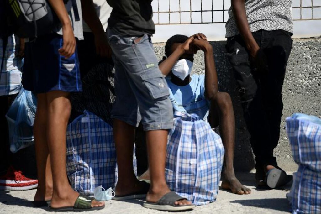 | Des migrants secourus en Méditerranée attendent avant d'embarquer à bord d'un ferry à Lampedusa, le 4 août 2022. |