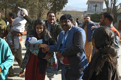 | Des chrétiens pakistanais en train d'être évacués après l'attentat contre leur église le 17 décembre à Quetta. |