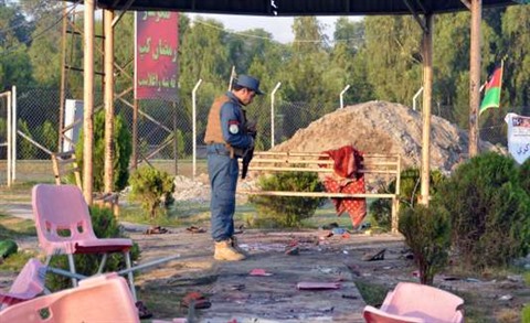 | Un policier inspecte les abords du stade visé vendredi soir 18 mai par des explosions à Jalalabad, en Afghanistan, samedi 19 mai 2018. |