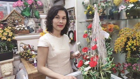 | L’artisane Nguyên Thi Huong Thuy dans sa boutique de fleurs en argile à Hanoï. |