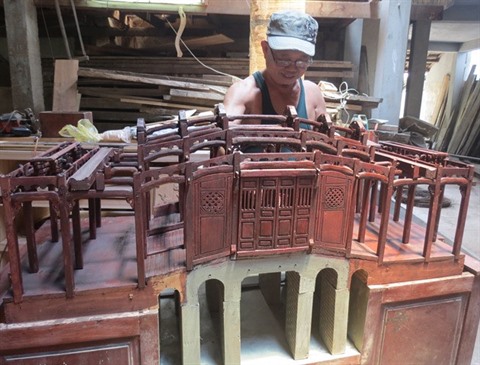 | L'artisan Huynh Ri travaille dans son atelier situé au village de menuiserie de Kim Bông, dans la province de Quang Nam (Centre). |