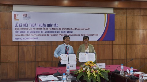 | Signature du partenariat en matière de formation d’experts francophones entre l’Institut polytechnique de Hanoï (IPH) et l’Agence universitaire de la Francophonie (AUF), le 20 août à Hanoï. |