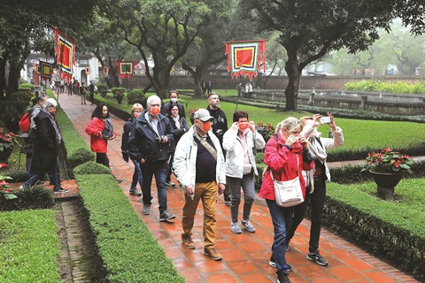 | Touristes étrangers portant des masques de protection en visitant le Temple de la Littérature à Hanoï. |