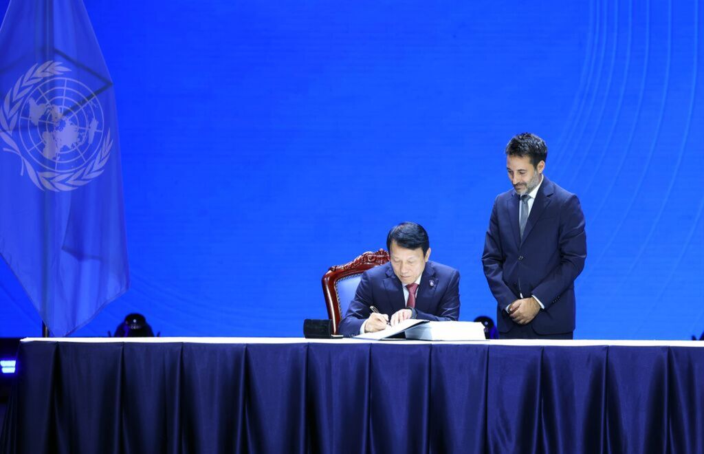 | Le ministre vietnamien de la Police, Luong Tam Quang, signe la Convention des Nations unies contre la cybercriminalité, le 25 octobre à Hanoï. |