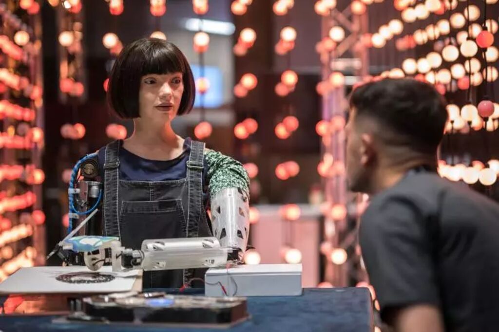 | Le robot réaliste "Ai-Da" (gauche) utilisant l'IA présenté au Sommet mondial AI for Good de l'Union internationale des télécommunications à Genève, le 30 mai en Suisse. |