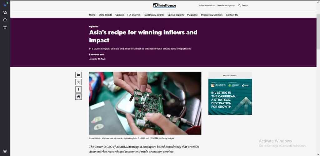 Selon l’article, comme dans d'autres régions, le succès ou l'échec des investissement direct étranger (IDE) entrants en Asie dépend de chaque projet. Mais la géopolitique, l'économie, un environnement opérationnel favorable et les différences culturelles sous-tendent la trajectoire des IDE dans la région.