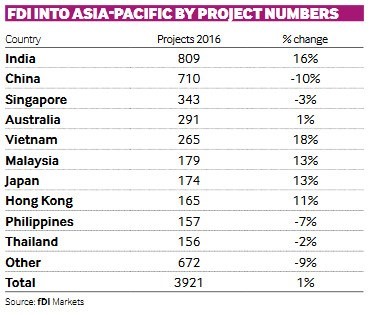 Le Vietnam figure dans le top 5 de l'attrait de l’IDE en Asie Pacifique, passant devant Singapour et l’Australie. Le pays occupe le 4e rang avec 36,6 milliards de dollars d’IDE en 2016, et un nombre de projets d’IDE ayant augmenté de 18%.