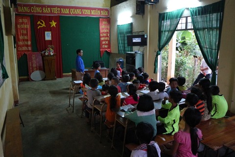 Avec le soutien de l’Union de la jeunesse de la commune et des autorités locales, la salle de conférence de la Maison communale du village est mobilisée chaque week-end pour se transformer en salle de classe. Minh utilise son ordinateur qu’il connecte à un écran téléviseur LCD pour animer ses cours. Les manuels sont tous préparés et rédigés par ses soins. Le tout suffit pour ses deux heures de cours.