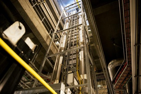 | Un détail de l'usine pilote de capture de CO2 installé dans l'incinérateur de déchets d'Amager Bakke à Copenhague le 24 juin 2021. |