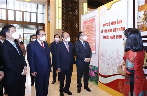 Avant la conférence, les délégués ont visité et entendu l'introduction de l'exposition "La culture éclaire la voie à suivre pour la nation", qui rassemble 320 œuvres d'art typiques, 123 documents et artefacts rares. Ces œuvres sont présentées en six thèmes selon le flux de la culture vietnamienne traditionnel comme moderne.