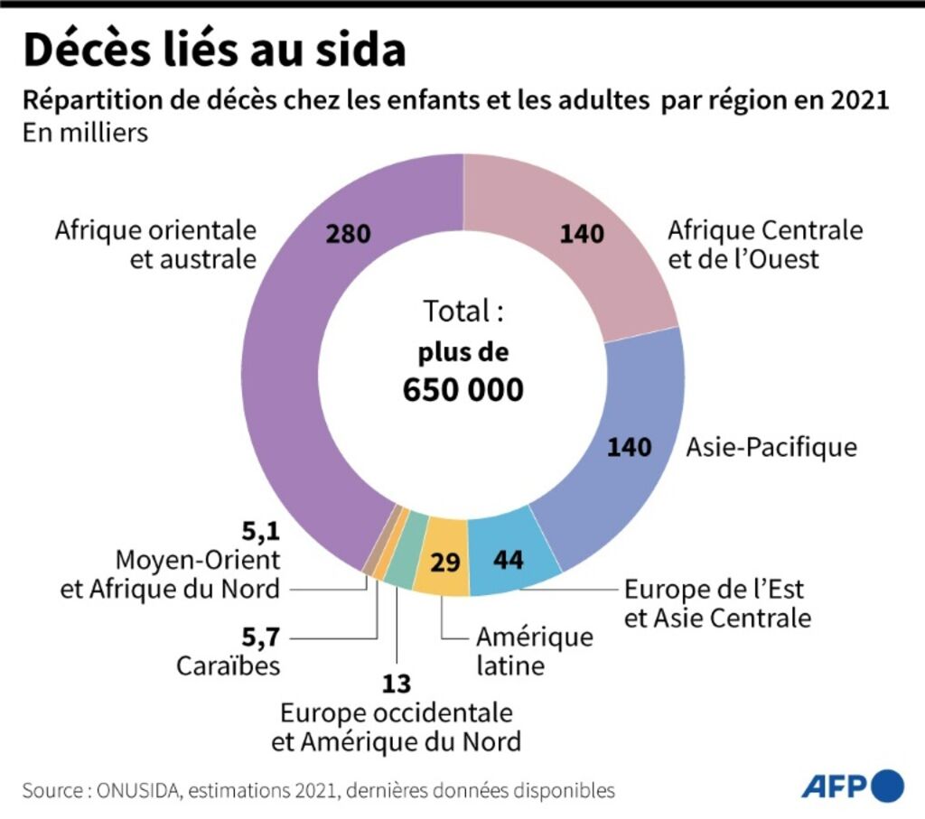 | Graphique montrant le nombre de décès d'enfants et d'adultes liés au sida dans le monde en 2021, selon l'ONUSIDA. |