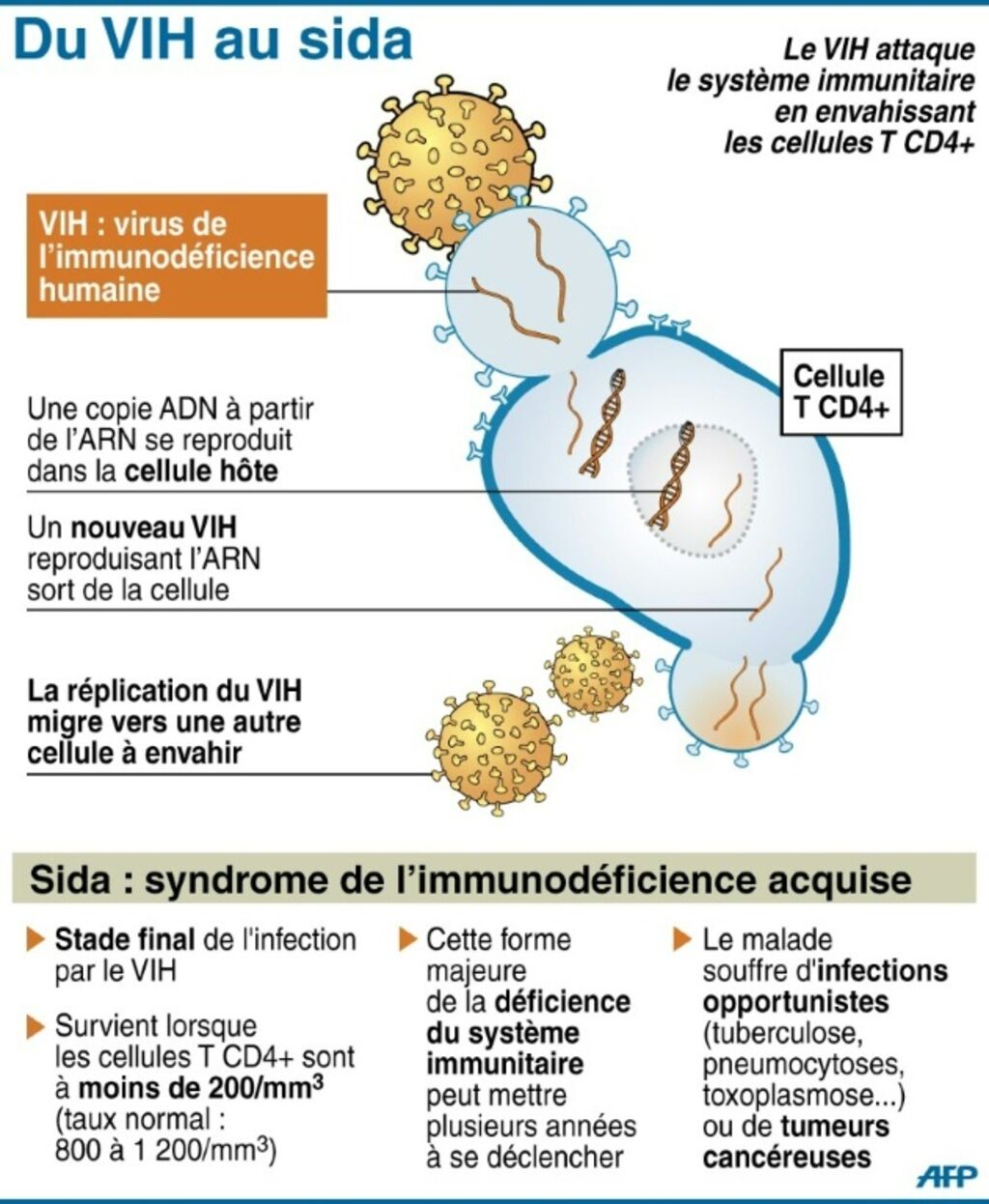 | Schéma expliquant comment le virus du sida attaque les cellules T CD4+ (90x110 mm). |