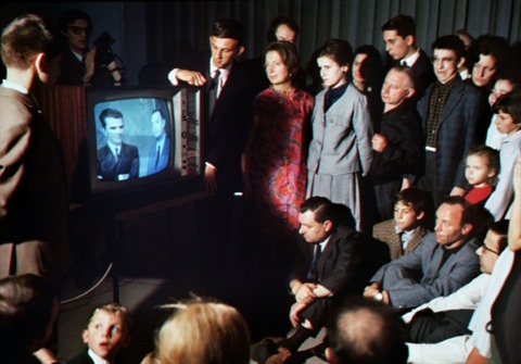 | Le 1er octobre 1967 : des téléspectateurs, à Paris, devant le premier programme en couleur diffusé à la télévision française. |
