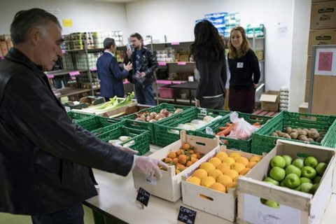 | Des bénévoles organisent la distribution de nourriture dans un local des Restos du Cœur à Paris, le 21 novembre 2017. |
