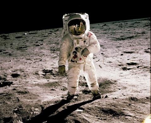 | Buzz Aldrin le 20 juillet 1969 sur la Lune, photographié par Neil Armstrong, visible dans le reflet de la visière de son coéquipier. |