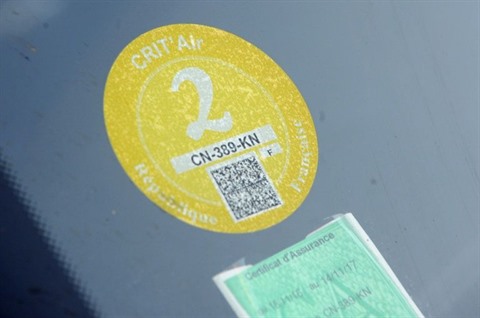 | Une vignette anti-pollution "Crit'Air" sur le pare-brise d'une voiture, le 13 décembre à Grenoble. |