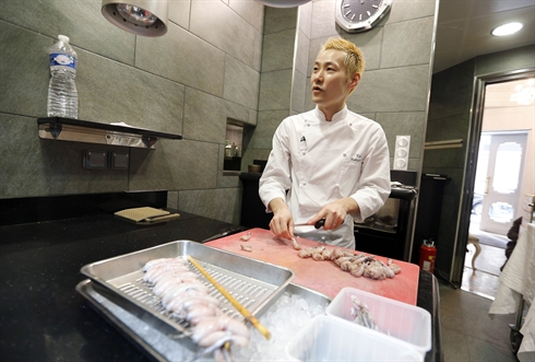 | Le chef Kei Kobayashi en plein préparation de cuisses de grenouilles. |