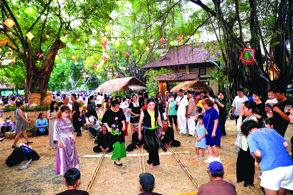 | Visiteurs découvrant la "nhay sap" (danse aux perches de bambou). |