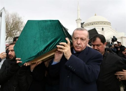 | Photo diffusée par la présidence turque le 9 février montrant le président turc Recep Tayyip Erdogan portant un cercueil à l'enterrement de neuf personnes tuées dans l'effondrement d'un immeuble à Istanbul. |