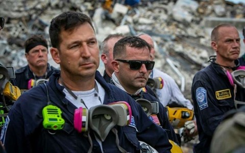 | Des membres des équipes de secours observent une minute de silence devant les décombres de l'immeuble qui s'est effondré à Surfside, le 7 juillet en Floride. |