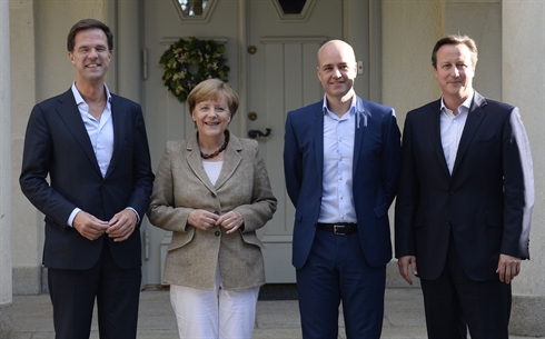 | Le Premier ministre néerlandais Mark Rutte (gauche), la chancelière allemande Angela Merkel, les Premiers ministres suédois Fredrik Reinfeldt (2e à droite), britannique David Cameron, le 9 juin à Stockholm. |