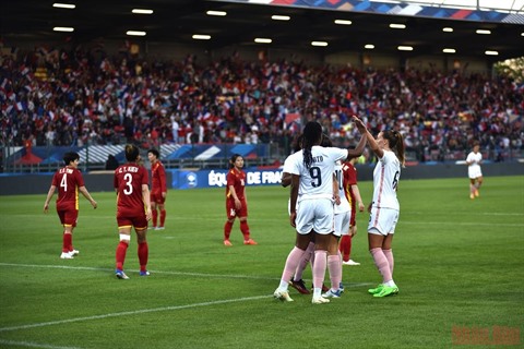 | Lors du match entre les équipes féminines vietnamienne (maillot rouge) et française, le 1er juillet à Orléans, en France. |