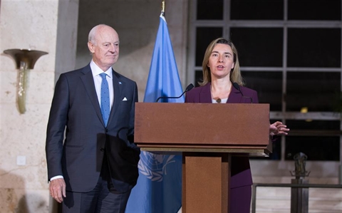 "La responsabilité que nous avons tous est de trouver la paix pour la Syrie, avant tout pour les Syriens mais aussi pour la région et l'Europe", a déclaré Mme Mogherini lors d'une conférence de presse conjointe avec l'envoyé spécial de l'ONU pour la Syrie, Staffan de Mistura.