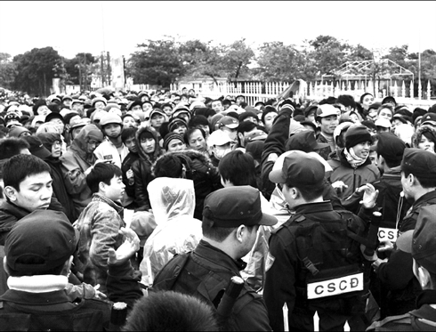 Plutôt que de courir le risque de perdre la face en m’énervant, voici les tactiques que je mets en oeuvre, et qui me permettent de garder ma place, même quelquefois, d’en gagner quelques unes ! J’utilise souvent la technique dite du monolithe : profitant de ma corpulence et de mon expérience de talonneur de rugby, j’essuie les coups de coudes ou d’épaules, sans broncher et surtout sans bouger. Après quelques tentatives, l’adversaire se fatigue (ou se fait mal !) et renonce à renverser l’obstacle, préférant le contourner. Intervient alors la seconde technique, qui consiste à tendre la jambe sur le trajet de contournement, emprunté par le «décidé à me passer devant», tout en écartant les coudes, pour bloquer son passage. Cà me donne une attitude d’éléphant prêt à prendre son envol, mais c’est redoutablement efficace. Las, d’avoir mes pieds dans les siens et mes coudes dans le nez, le «coupeur de fil» opte pour l’affrontement direct. Il ou elle me regarde avec le sourire, appuie sur mon bras, me signifiant ouvertement qu’il ou elle a la ferme intention d’usurper ma position dans la file. Dans ce cas, je souris à mon tour et lui assène inexorablement : «Em (ou anh, bà, chi, ông, cháu, selon le cas…) phải cho môt lúc nhé !» (Il faut attendre un peu hein !) sans bouger d’un poil ! À dire vrai, il m’est arrivé une fois ou deux d’utiliser des techniques plus rudes, notamment en mettant fermement ma main sur l’épaule de l’outrecuidant, pour le forcer à me regarder et lui dire d’un ton ferme : «Tai sao anh (ou… selon le cas) lai xúc pham anh (ou… selon le cas) ? (Pourquoi m’offensez-vous ?), ou encore «Tai sao chi… làm anh buôn ?» (Pourquoi me rendez-vous triste ?). Le temps que mon interlocuteur revienne de sa surprise d’entendre un étranger lui parler vietnamien, et surtout comprenne en quoi il m’offense ou me rend malheureux, je reprends ma place avec un grand sourire, accompagné d’un retentissant «Cám on !».