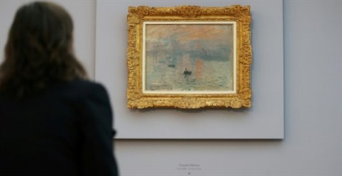 | Une visiteuse admire le tableau "Impression, soleil levant" du peintre français Claude Monet exposé au "MuMa" du Havre, le 6 septembre 2017. |
