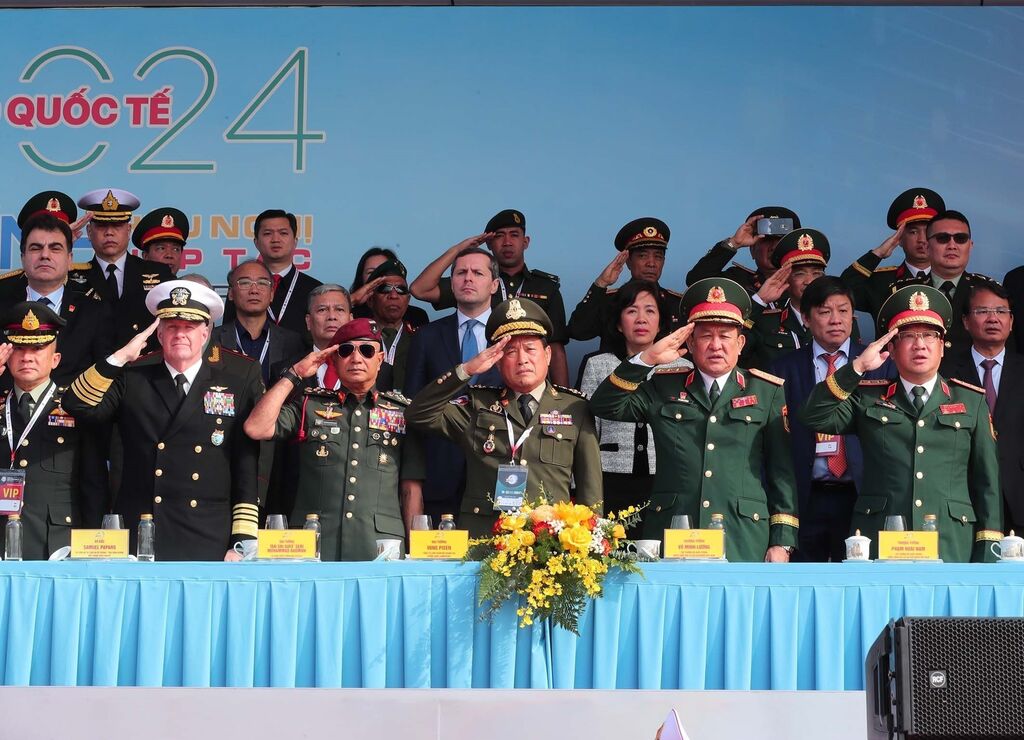 | Les représentants du ministère de la Défense, les attachés militaires des différents pays assistent à l'ouverture de l’Exposition internationale de la défense du Vietnam 2024. |