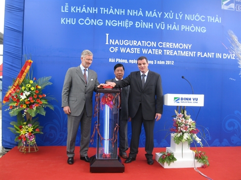 | Le prince héritier de Belgique (gauche) presse le bouton d’inauguration de la 1re phase de l’usine de traitement de l’eau usée Dinh Vu. |