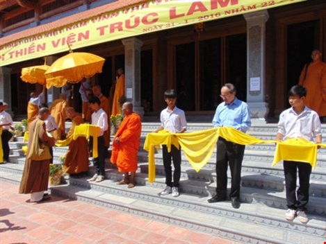 | Le président du FPV, Nguyên Thiên Nhân, coupe la bande d'inauguration de l'Institut bouddhique Trúc Lâm, le 31 janvier à Trà Vinh (Sud). |