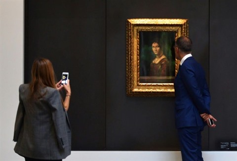 | Un couple regarde le tableau "La Belle Ferronière" de Léonard De Vinci au Louvre Abou Dhabi lors d'une visite organisée pour les médias, le 6 novembre. |
