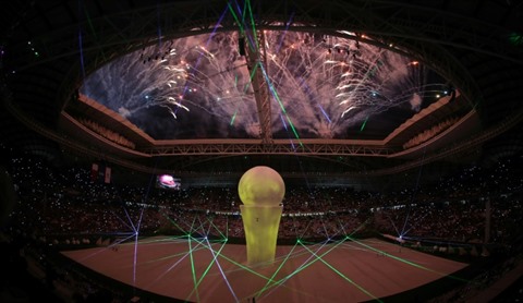 Lors d'une cérémonie qui a précédé le match, le stade a été plongé dans la pénombre tandis qu'une performance était exécutée par des artistes autour d'une perle gonflable géante illuminée au centre de la pelouse.