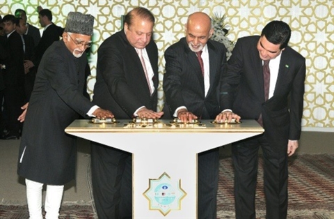 | De gauche à droite : le vice-président indien Hamid Ansari, le Premier ministre pakistanais Nawaz Sharif, le président afghan Ashraf Ghani et le président turkmène Gurbanguly Berdimohamedov, lors de la cérémonie d'inauguration d'un gazoduc. |