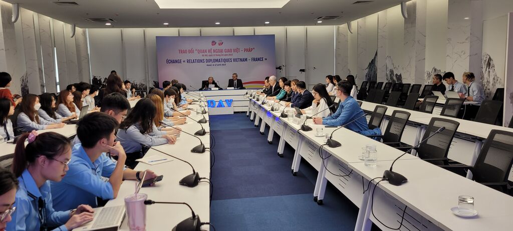Après la cérémonie d'inauguration de la bibliothèque francophone, s’est tenu l'échange sur les relations diplomatiques entre le Vietnam et la France, à laquelle ont participé des ambassadeurs vietnamiens, des diplomates français ainsi que de nombreux enseignants, chercheurs et étudiants francophones de l’ADV.
