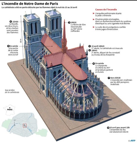La cathédrale gothique de l'île de la Cité, vieille de plus de 850 ans, a perdu sa flèche, sa toiture et une partie de sa voûte le 15 avril, ravagées par les flammes, alors que des opérations de restauration étaient en cours. L'incendie de ce lieu emblématique de la capitale, classé au patrimoine mondial de l'UNESCO, avait provoqué une vive émotion dans le monde et un élan de solidarité pour le restaurer.