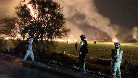 | Des soldats se tiennent près du feu provoqué par un oléoduc, à Tlahuelilpan (Centre du Mexique), le 18 janvier 2019. |