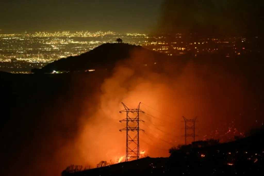 | Des flammes et de la fumée rougeoient près des lignes électriques alors que l'incendie s'étend près du quartier de Mandeville Canyon et d'Encino, en Californie, le 11 janvier. |