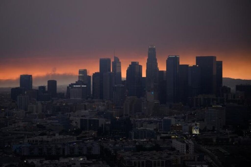 | La skyline de Los Angeles, recouverte d'un nuage de fumée noire à cause d'incendies, le 8 janvier. |