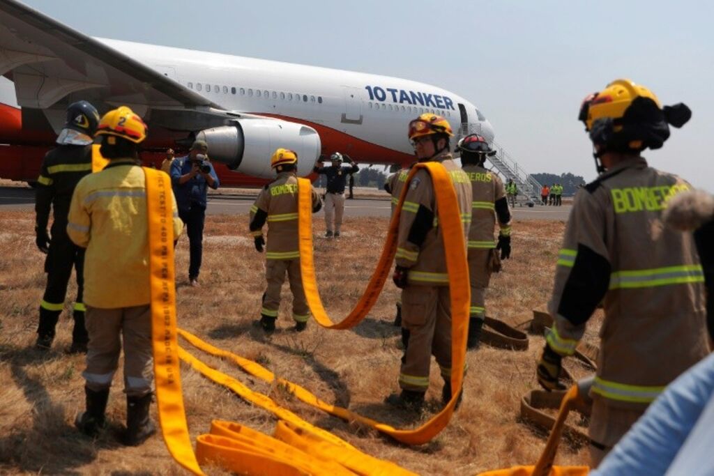 | Des pompiers se préparent à charger de l'eau dans un avion-citerne DC-10 américain à l'aéroport Carriel Sur de Concepcion, au Chili, le 6 février. |